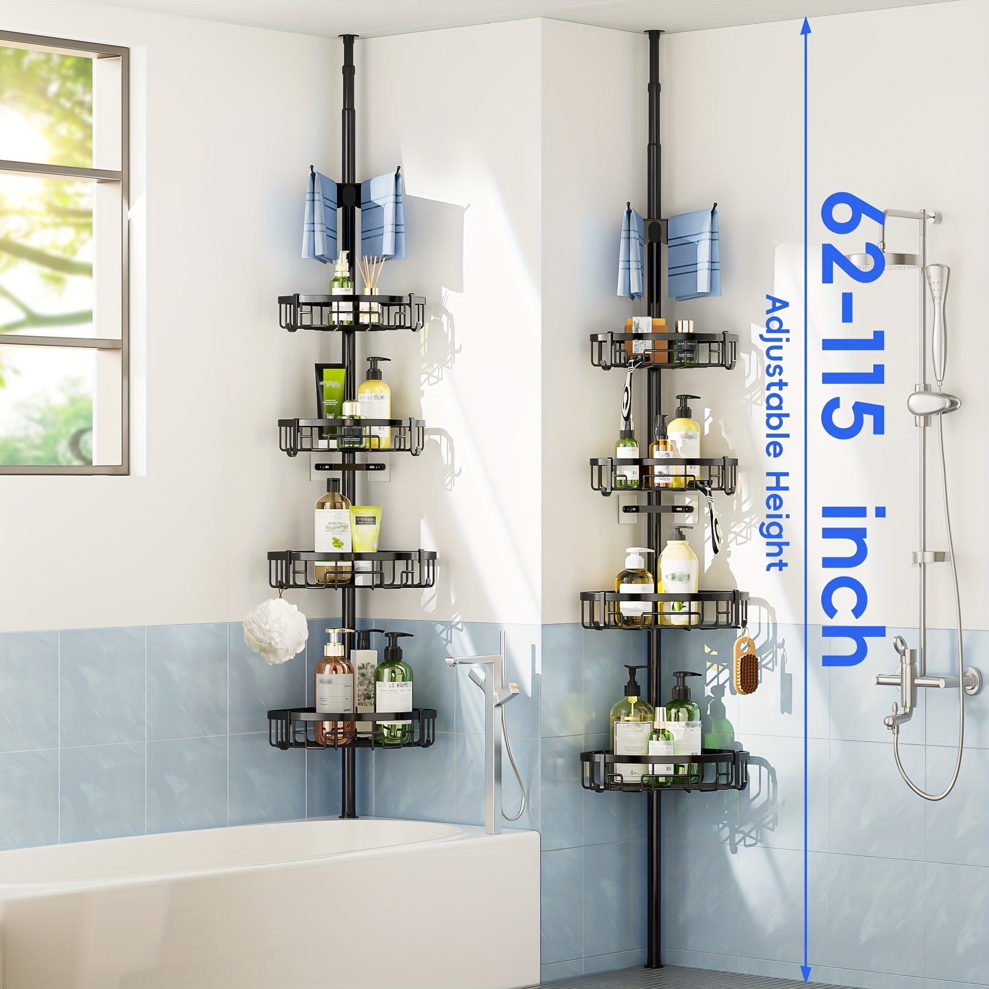 - 4-tier corner design provides ample storage for shampoo, conditioner, body wash, razors, loofahs, and more, without taking up floor space.