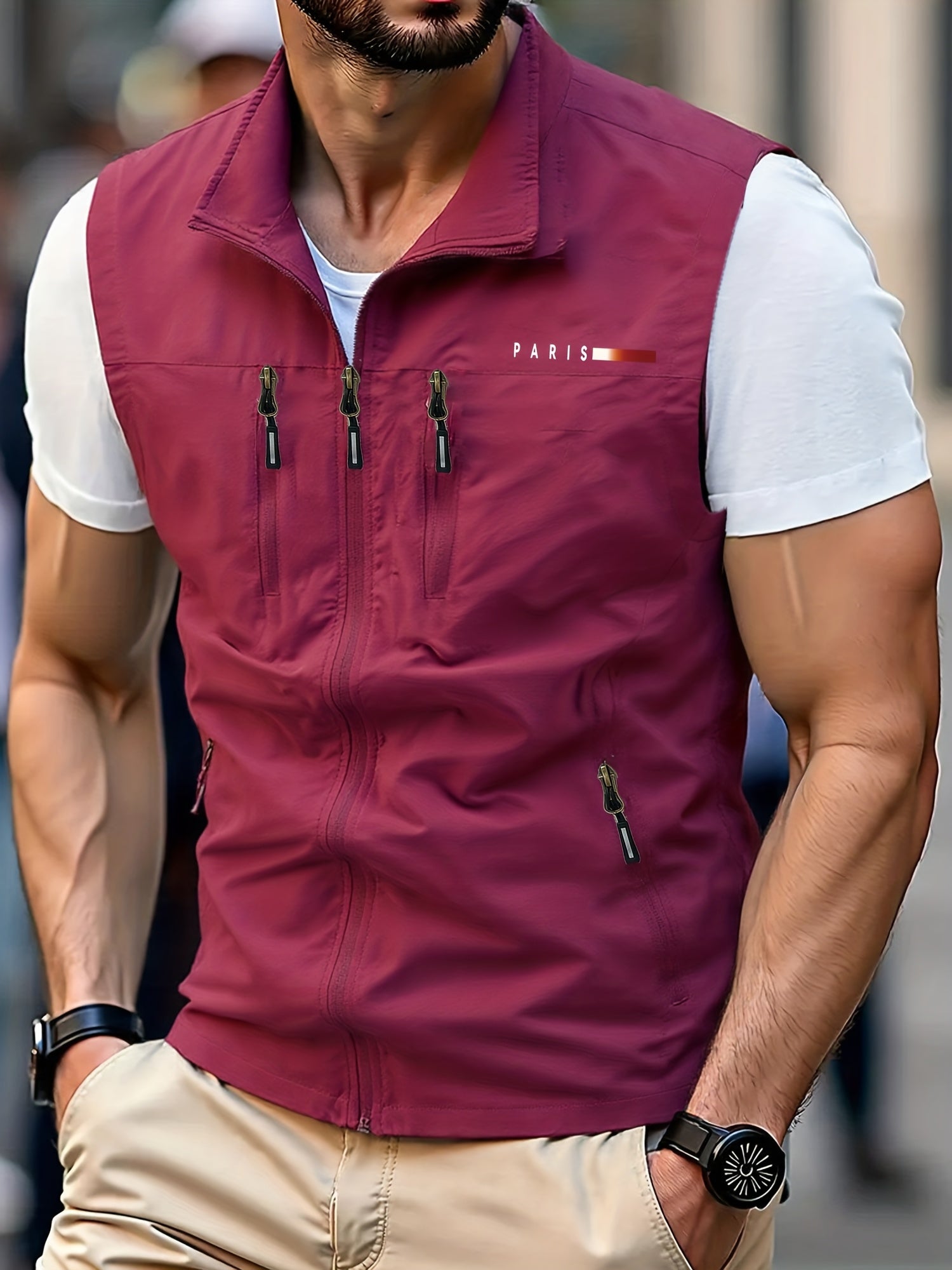 Men Casual Workwear Vest Paris Print Stand Collar Pockets is a versatile sleeveless vest designed for the modern man. Crafted from 100% polyester with a 100% polyester filler and lining, this woven vest delivers lightweight comfort and a regular-fit silhouette that’s perfect for casual days, weekend outings, and active adventures.