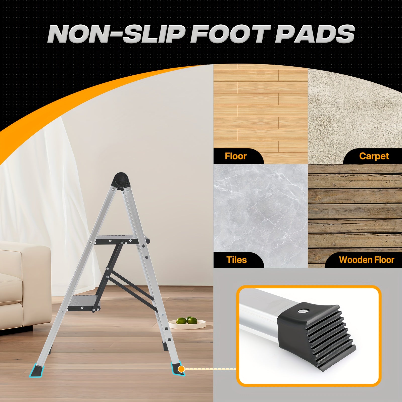 - Non-slip feet on each leg keep the ladder steady on most floor surfaces.