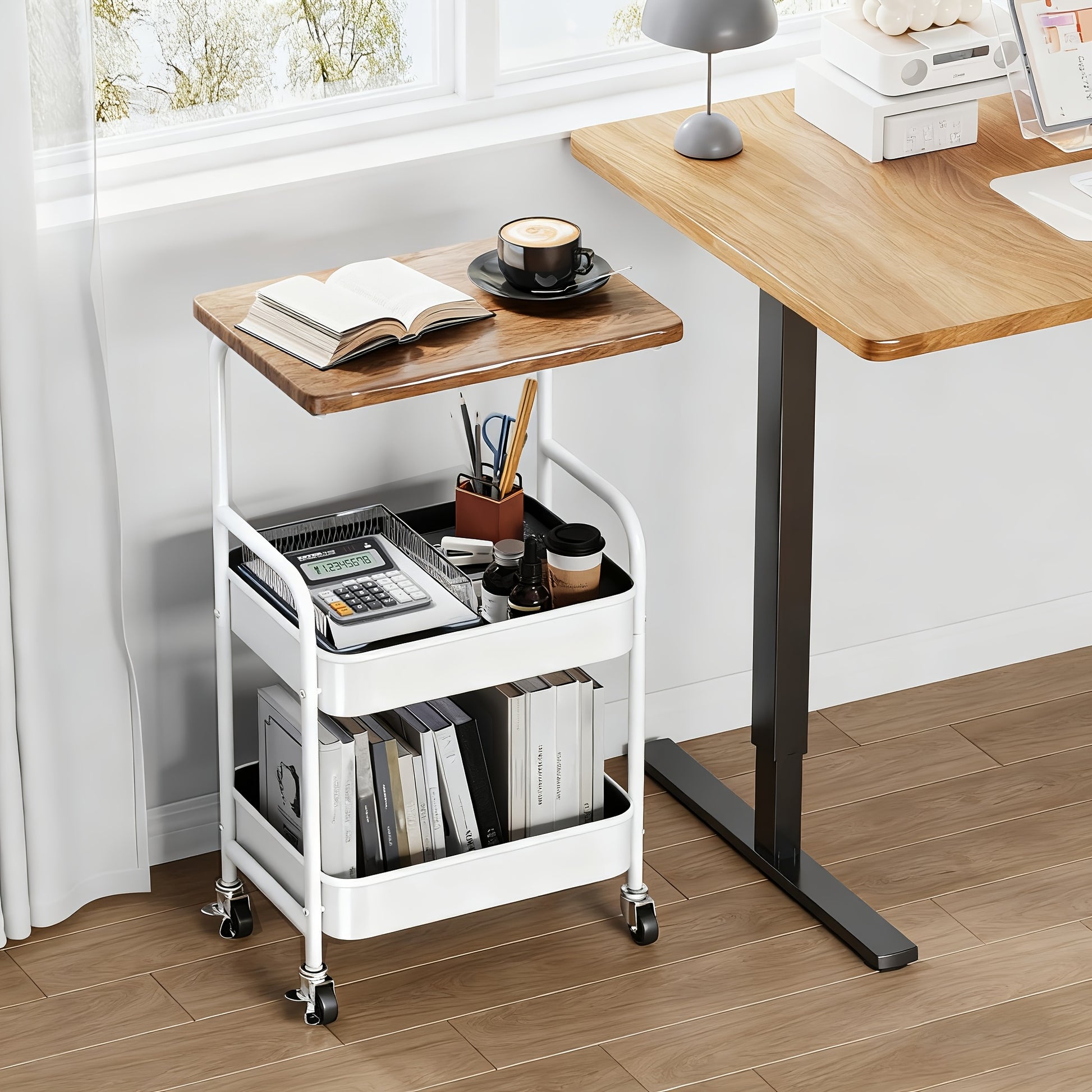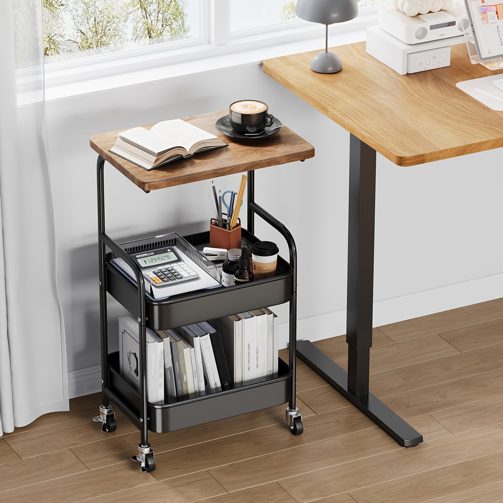 Transform clutter into organized productivity with the Rolling Cart With 3-Tier Metal Utility Cart. Crafted from durable carbon steel with a rotating stand, this mobile workstation moves smoothly on four 360° wheels, making it ideal for home, office, kitchen, or bedroom.