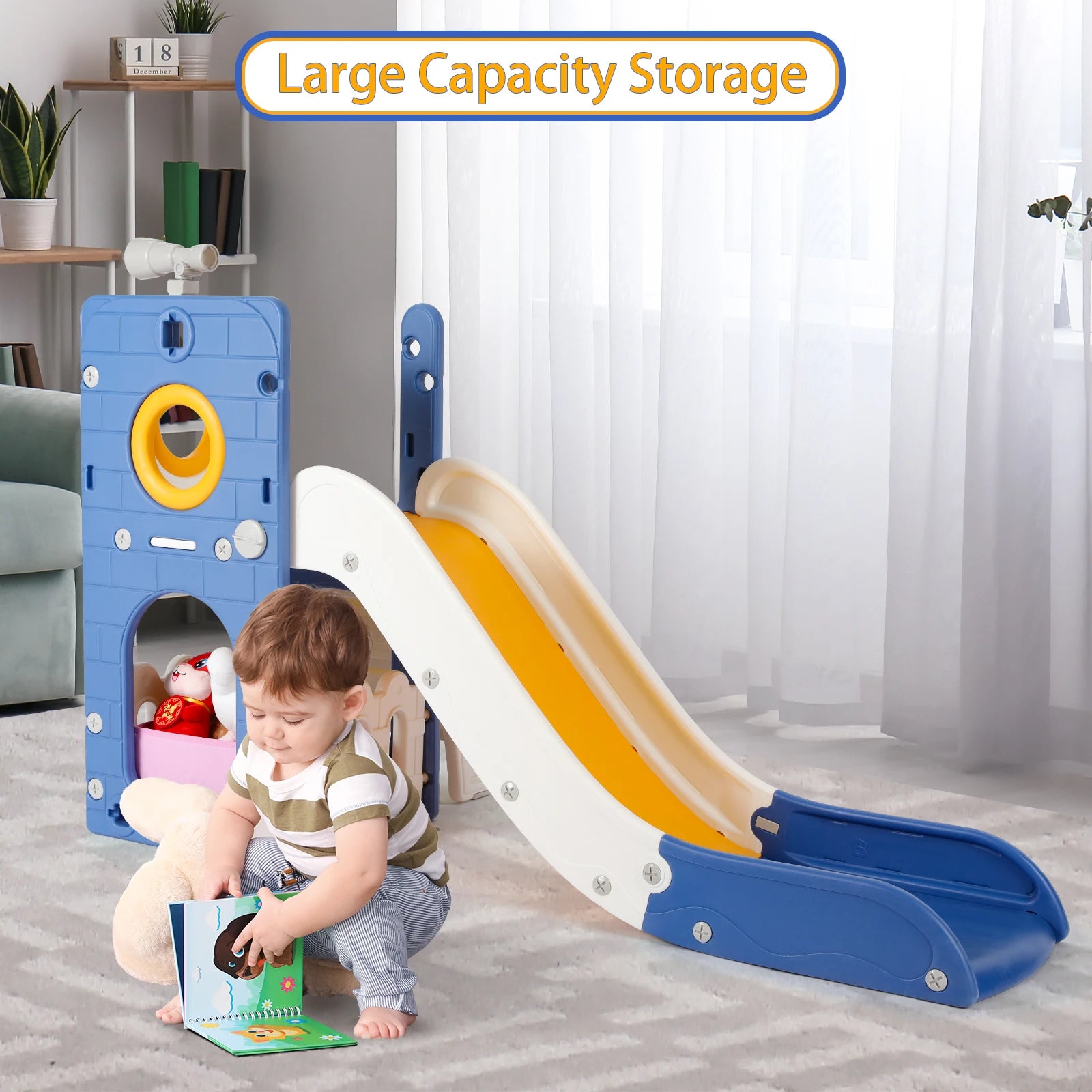 - 4-in-1 Activity Center: Not just a slide, this product also includes a basketball hoop, encouraging your child to develop their shooting skills while having fun!